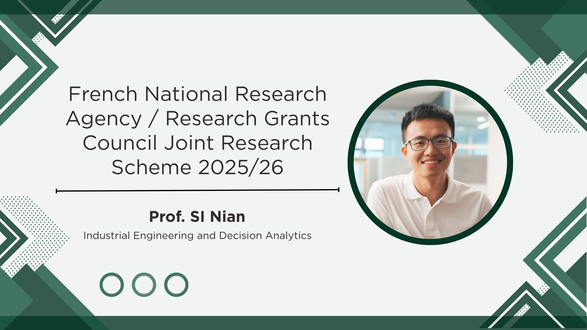 A project led by Prof. SI Nian, Assistant Professor of the Department of Industrial Engineering and Decision Analytics, was awarded HK$1.6 million under the French National Research Agency (ANR) / Research Grants Council (RGC) Joint Research Scheme 2025/26.