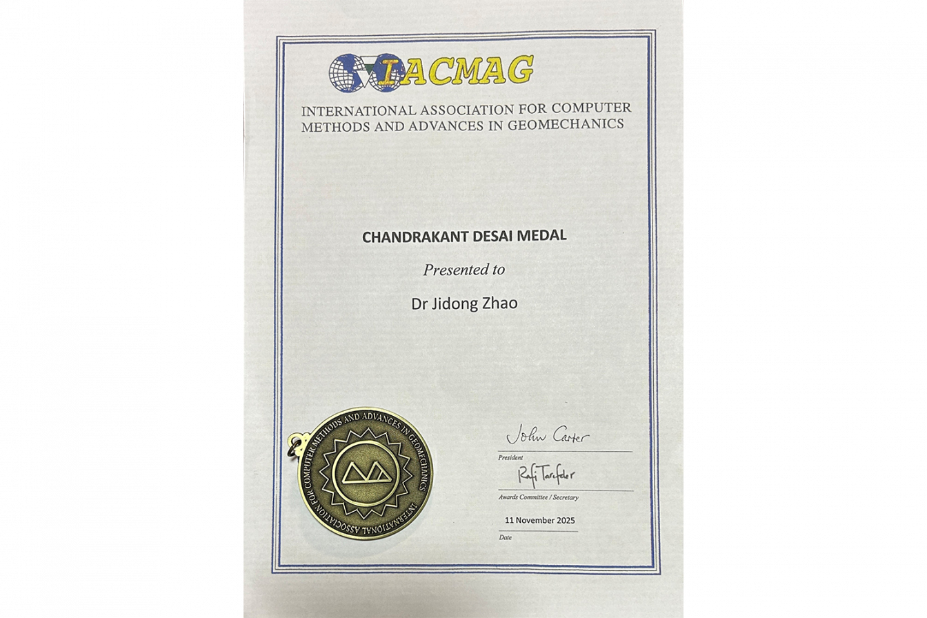 Prof. ZHAO Jidong, Professor of Civil and Environmental Engineering, has been awarded the prestigious 2025 Chandrakant S. Desai Excellence Medal by the International Association for Computer Methods and Advances in Geomechanics (IACMAG) and elected as chairman of two esteemed technical committees in computational geomechanics.