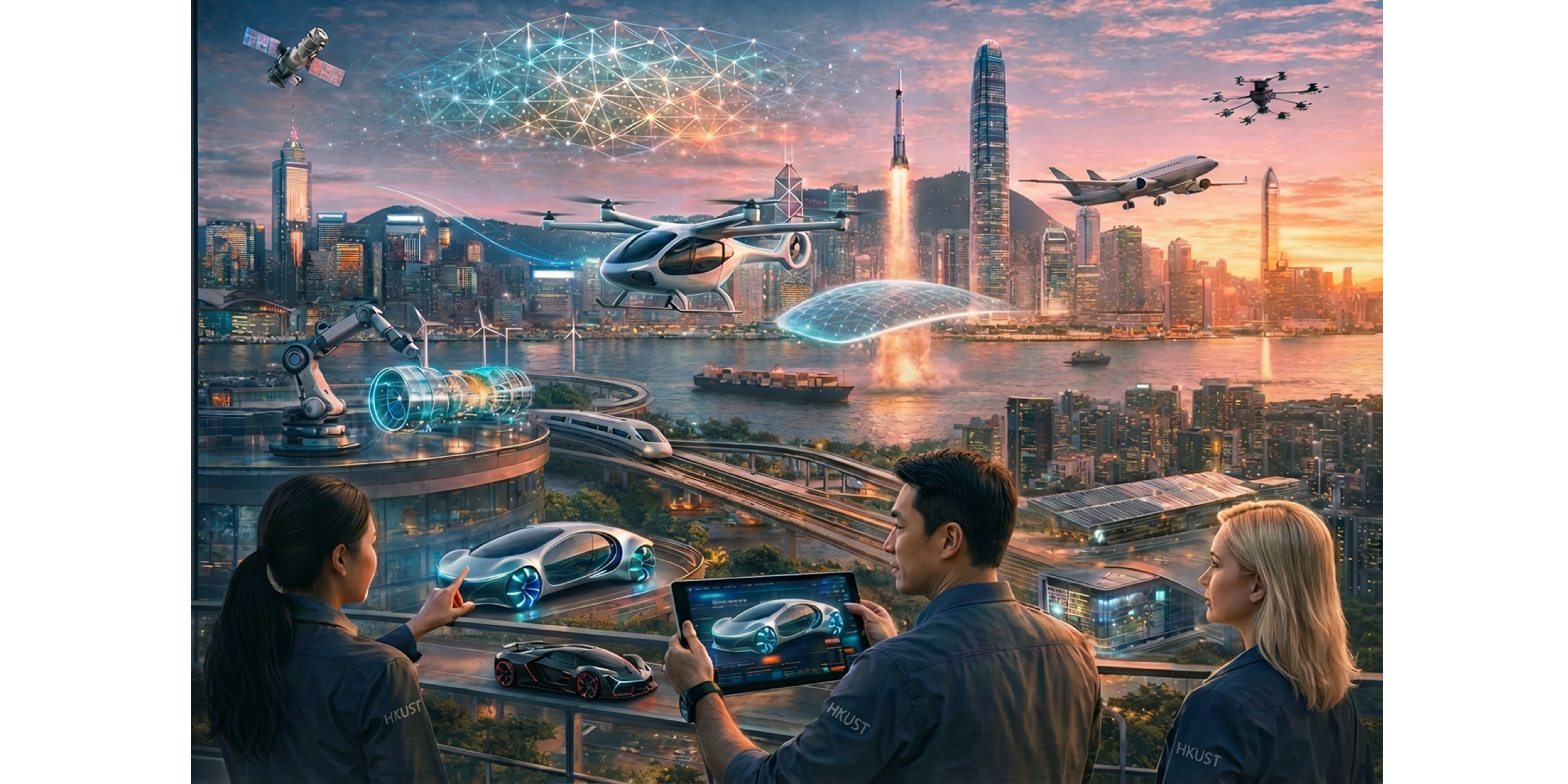 An AI-generated image illustrating the many facets of Mechanical and Aerospace Engineering (MAE): HKUST’s MAE programs empower students to shape the future by integrating AI, extended reality, and real-world innovation across air mobility, robotics, sustainable energy, smart manufacturing, advanced materials, space technologies, and beyond. [Download Photo]