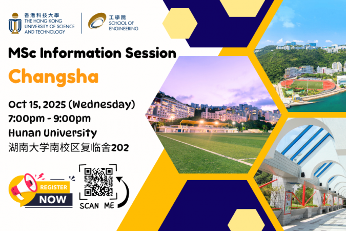 Taught Postgraduate Study Image Mobile Image Title 为什么选择科大工学院 Description 世界发展瞬息万变,科大工学院是知识交汇的焦点,提供最高瞻远瞩、最需求殷切的知识 More Research Title 2025年泰晤士高等教育世界大学分科排名:工程学 Description 连续14年香港首位 Submodule Image Title 最新消息 Come join the Information Session in Mainland (Central South University, Changsha) on 14 October 2025! REGISTER NOW Come join the Information Session in Mainland (Hunan University, Changsha) on 15 October 2025! REGISTER NOW Come join the Information Session in Mainland (Xiamen University, Xiamen) on 16 October 2025! REGISTER NOW The Hong Kong Government has recently launched the Hong Kong Future Talent Scholarship Scheme for Advanced Studies (FTSS), and HKUST is recruiting outstanding local students for 2026/27 Fall Intake. Candidates who are interested in applying for the FTSS scholarship should submit the application for 2026/27 academic year by 28 Feb 2026. Learn More 马上申请工程学理学硕士国际奖学金。不要错过难得机会,争取高达10万港元的奖学金! 更多 参与资讯讲座 更多 More Research Title 理学硕士课程 Description 透过我们多元化的课程,深入各专属工程学领域,吸收最先进和实用的知识 Submodule Image Title 航空工程 Image Title 人工智能 Image Title 人工智能与创业 Image Title 大数据科技 Image Title 生物分子工程与健康信息学 Image Title 化学工程及能源工程学 Image Title 土木基建工程及管理 Image Title 数码及可持续城市 Image Title 电子工程学 Image Title 工程企业管理学 Image Title 环境工程学及管理 Image Title 金融科技 Image Title 集成电路 Image Title 资讯科技 Image Title 智能建筑物技术与管理 Image Title 材料工程 Image Title 机械工程学 Image Title 电信学 其他资料 资讯讲座 理学硕士课程的新闻及公布 下载小册子 质素保证 常见问题 联络我们 Title 申请 Description 如果你有意突破工程学的基础,又或发现工程学才是你的真正目标,我们的理学硕士课程可满足你的需要。快来加入我们! Submodule Image Title 增益及学生资源 Description 我们备有多个渠道,在你追寻精密工程学知识的路上全程提供支持 Submodule 授课式研究生相册 交流学习 就业发展计划 校园生活 奖学金及资助 Pop Up https://seng.hkust.edu.hk/academics/taught-postgraduate/info-session