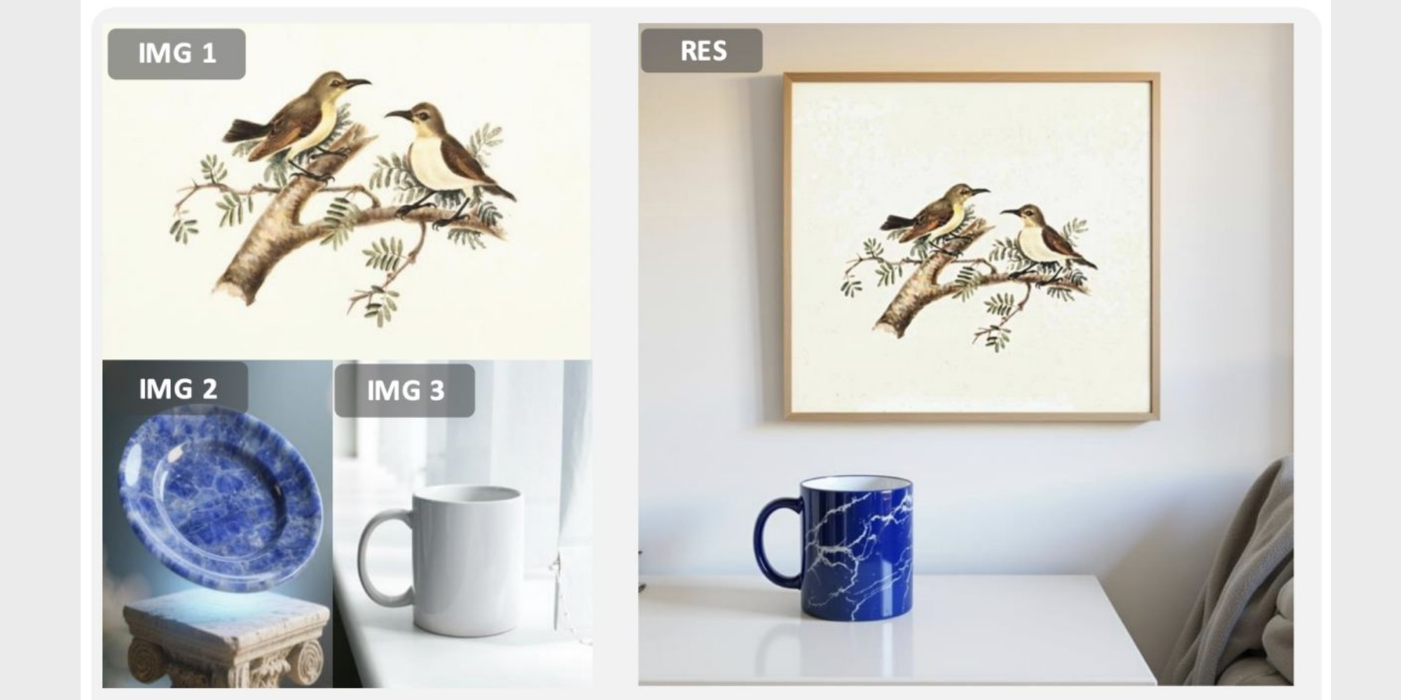 在多模態指令生成任務中,DreamOmni2能基於圖片中的實體進行圖像生成,例如提取圖一的畫作掛在臥室牆上,將圖二盤子的材質套用在圖三的水杯,並將水杯放置在桌子上,以生成符合用家要求的新圖像。 [Download Photo]