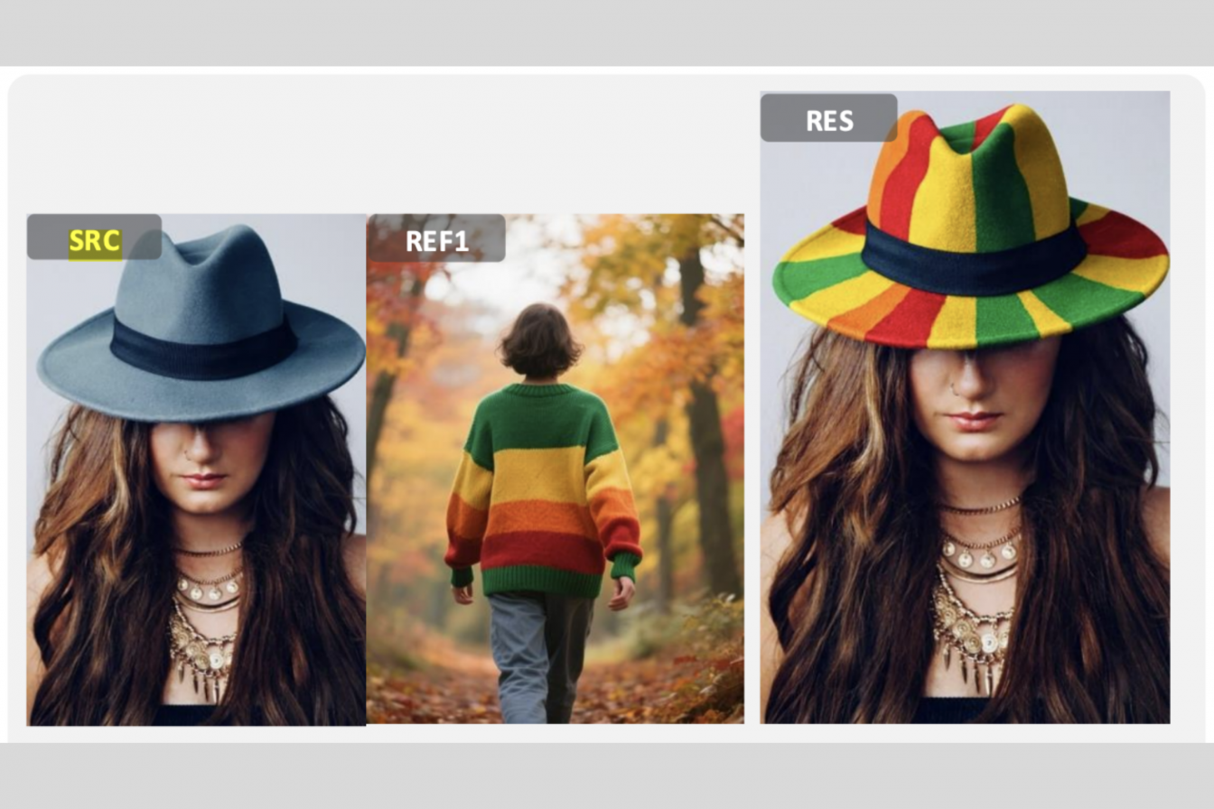 在多模態指令編輯任務中,DreamOmni2的表現亦非常優秀,例如將圖中帽子的顏色變成與另一張圖毛衣相同的配色(圖示二)。